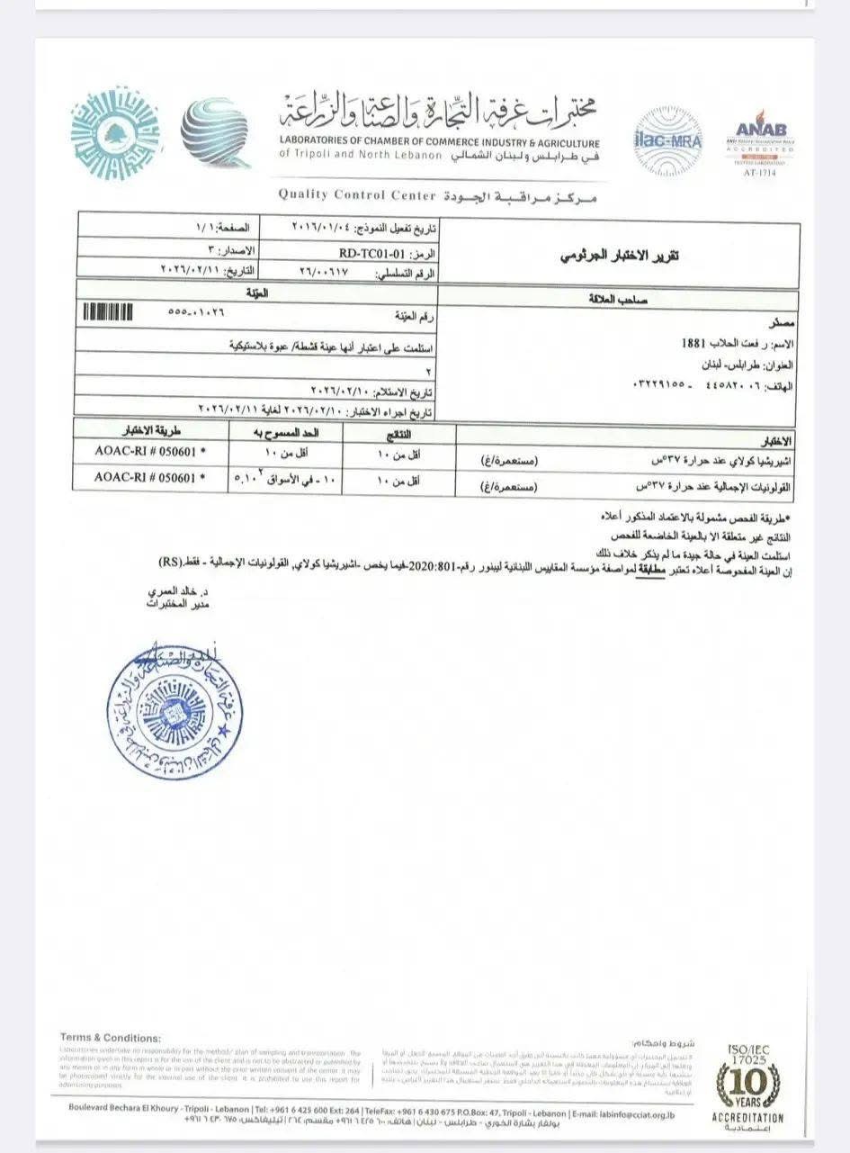 نؤكد لزبائننا الكرام أن منتجاتنا تخضع لمراقبة دائمة وإجراءات صارمة لضمان الجودة، وعليه سنقوم بنشر فحوصاتنا المخبرية تباعاً وذلك لضمان السلامة العامة والحفاظ على ثقة زبائننا الدائمة بمنتوجاتنا.