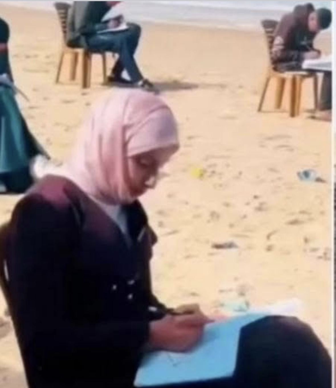 مجموعة من الطلاب الفلسطينيين وهم يخضعون لامتحانات على شاطئ غزة في ظل تدمـــ،،ــير المدارس والجامعات بالقطاع؛، بمشهد يجسد قوة الإرادة بمواجهة الظروف الصعبة.